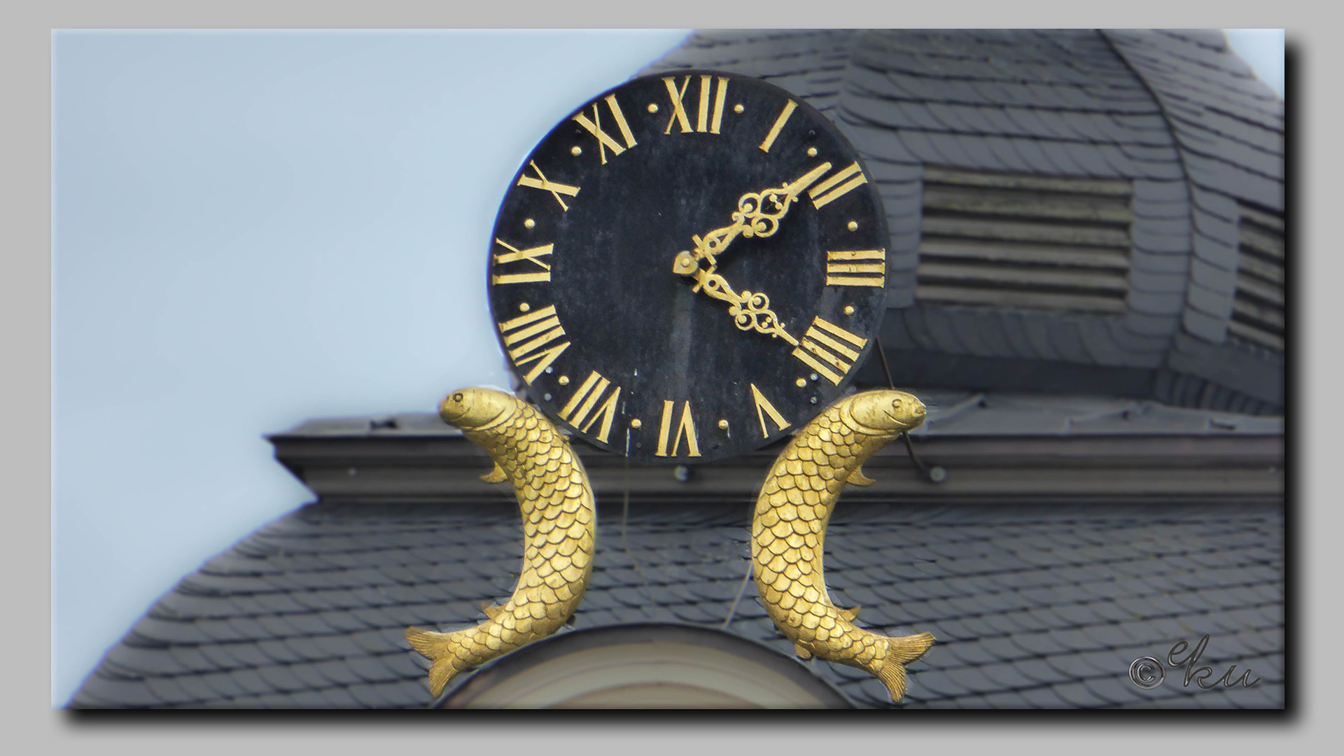 Die Uhr am Schloß zeigt uns, was die Stunde geschlagen hat.