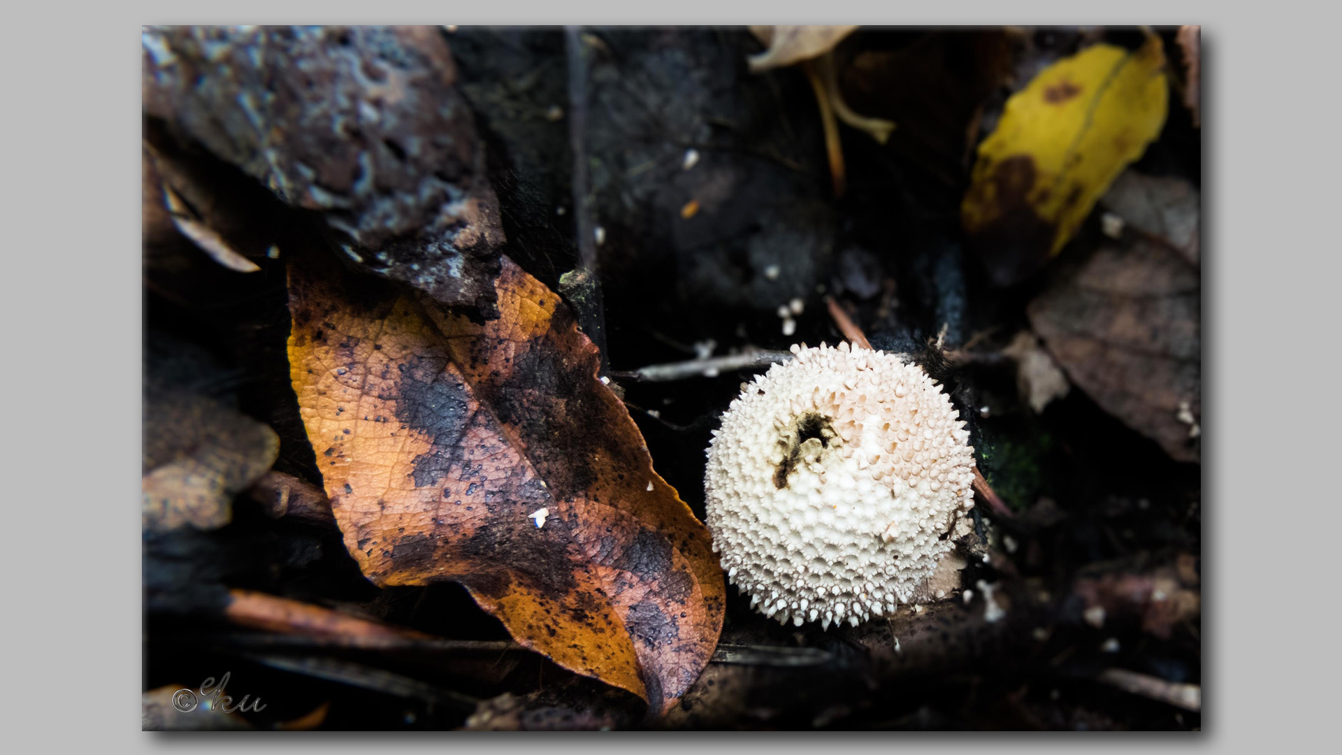 Nein, ich bin kein Golfball, nur ein kleiner Flaschenbovist im Wald.